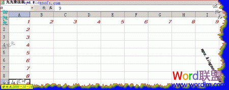 1、建立一个空白表格,在A1输入1,拖动鼠标左I向右至I1、向下至A9,这样A1到I1、A1到A9内就分别输入1到9(如图1):