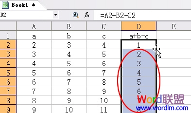 鼠标变成黑十字,双击,看看,剩下数的都按公式“a+b-c”计算好了,见图2: