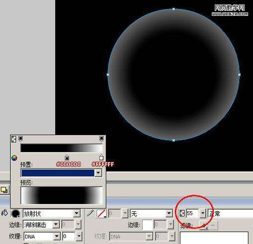 启动Fireworks -> 将背景调成“黑色”,在画布中画一个圆。